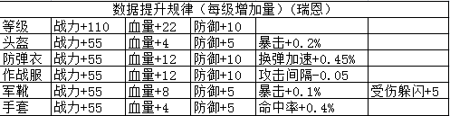 战力计算公式:等级*每级提升量*2+(头盔等级-1+进阶次数*2)*每级提升量+(防弹衣等级-1+进阶次数*2)*每级提升量+(作战服等级-1+进阶次数*2)*每级提升量+(军靴等级-1+进阶次数*2)*每级提升量+(手套等级-1+进阶次数*2)*每级提升量+初始值