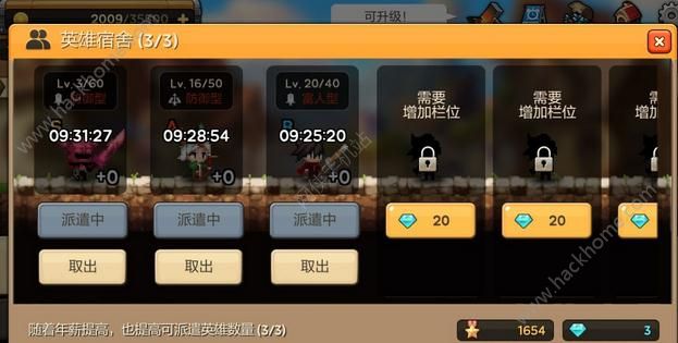 在宿舍里派遣英雄去探索,有1、3、5、10小时的选项,可以获得钻石、彩钻、名誉、 金币。