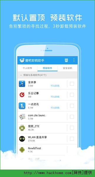 2、 默认置顶预装软件,告别繁琐的寻找过程,3秒卸载预装软件;