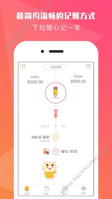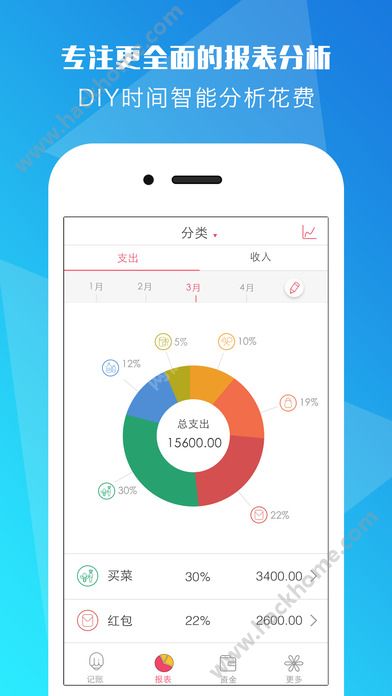 4、报表更全面:报表分析多维度,饼图看分类收支占比,折线图看收支趋势,更好分析你的财务状况。