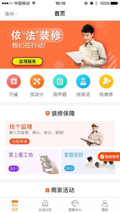 4、“巧雀装修保”以徐州为运营中心,以直观可视化形式将中心数据连接手机端,方便业主、施工方在手机上观看工地进度详情,在线申请三方验收(业主、施工方、巧雀装修保)监理视频验收详情,施工完毕后在线申请售后保单,通过全方位的保障计划,让业主放心、省心。