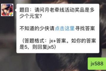 新剑侠情缘手游月老牵线活动奖品是什么?新剑侠情缘手游月老牵线活动奖励多少元宝?新剑侠情缘手游月老牵线活动奖品内容是12月11日每日一题题目哦,那么答案究竟是什么呢,下面就让嗨客小卷子来告诉大家吧! 12月11日每日一题答案 Q:新剑侠情缘手游月老牵线活动奖品是多少个元宝?(答题格式:jx答案) A:jx588 2017-12-11451